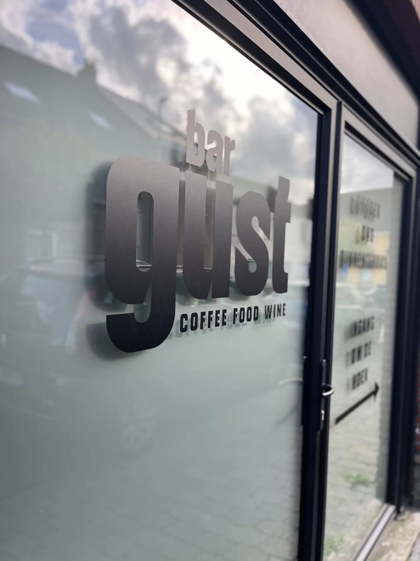 Bar Gust: een heerlijke plek om koffie te degusteren in hartje Wezemaal. De belettering sluit perfect aan bij de kruisverdeling van het raam, waardoor alles één mooi geheel vormt. De opslagruimte achter het glas is slim weggewerkt met zandstraalfolie, en dankzij die witte achtergrond krijgt de matte, zwarte belettering extra diepte en uitstraling. Ook zo’n stijlvolle en functionele raamafwerking voor jouw zaak? Wij denken graag met je mee!